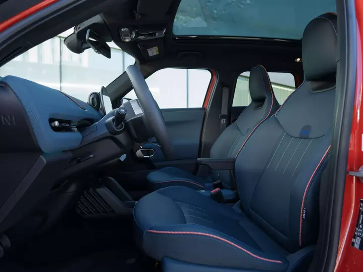 Sisätilat ovat yhtä makeat kuin ulkokuorikin. Petrolinsinistä verhoilua piristää oranssi kontrastiväri, kojelaudassa komeileva kolmiulotteinen kangas ja istuimien laskuvarjonarut kahdessa sävyssä. Mini on onnistunut lisäämään värejä ja yksityiskohtia hyvää makua hukkaamatta.