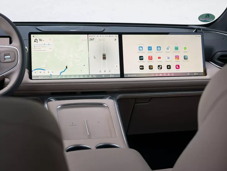 Ohjaamon keskiössä on 15-tuumainen kosketusnäyttö, jonka käyttöliittymä muistuttaa häkellyttävän paljon Teslaa. Perinteisiä painikkeita löytyy kuitenkin enemmän kuin pienemmästä G6-mallista, mikä tuntuu premiumilta ratkaisulta. Ohjauspyörässä on edelleen painettavat rullat, ja ratin takana on 10,25-tuumainen digitaalinen mittaristo.
