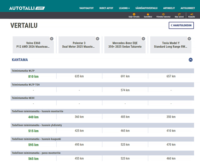 Palvelusta voit etsiä autoja merkkien ja mallien mukaan tai tietyillä ominaisuuksilla, kuten akkukapasiteetin, sähköisen kantaman tai lataustehon perusteella. Löytäessäsi palvelusta sopivia autoja, voit helposti lisätä vertailuun enintään neljä mallia ja vertailla niiden ominaisuuksia keskenään. Mallien todelliset erot hahmottuvat näin parhaiten yhdellä silmäyksellä.