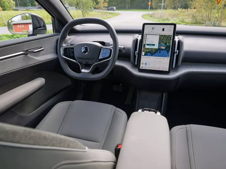 Ohjaamo on pelkistetty ja volvomaisesta tunnelmasta poikkeava. Kaikki toiminnot on piilotettu kosketusnäytön taakse, mikä heikentää käytettävyyttä. Perinteisen mittariston puuttuminen pakottaa kuljettajan kääntämään katseensa pois tiestä nähdäkseen nopeuden keskellä kojelautaa sijaitsevalta 12,3-tuumaiselta pystynäytöltä.
